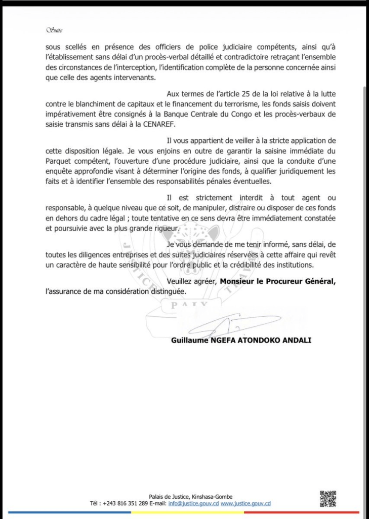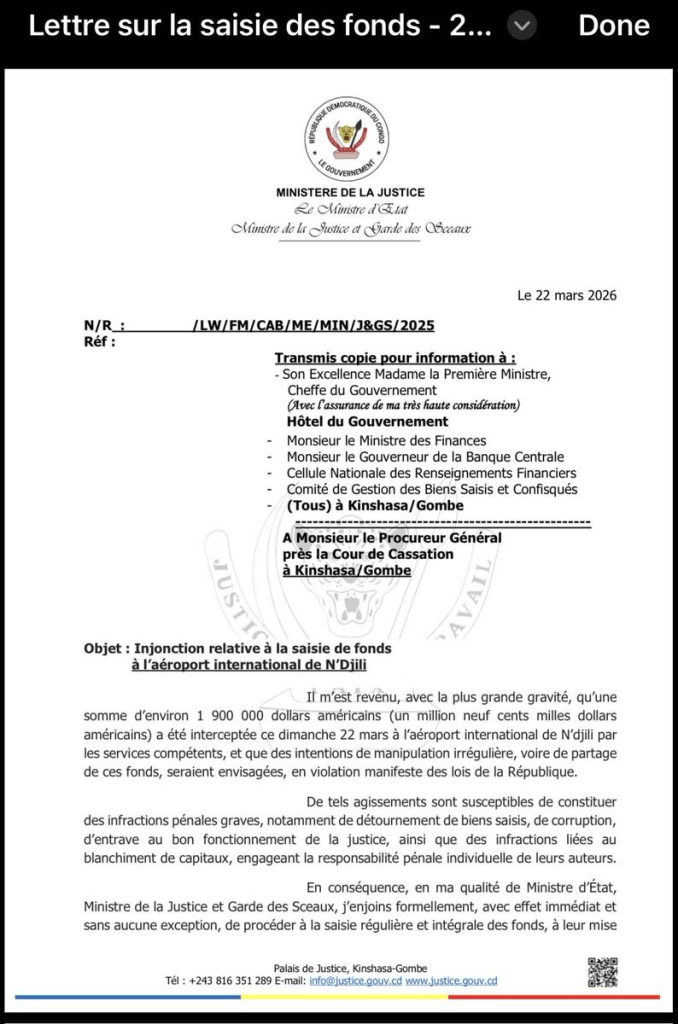 Le même jour, il dégaine une lettre officielle, datée du 22 mars, adressée au Procureur général près la Cour de cassation. Un texte glaçant, sans détour : « Il m’est revenu, avec la plus grande gravité, qu’une somme d’environ 1.900.000 dollars américains a été interceptée ce dimanche 22 mars à l’aéroport international de N’djili […] et que des intentions de manipulation irrégulière, voire de partage de ces fonds, seraient envisagées, en violation manifeste des lois de la République. »