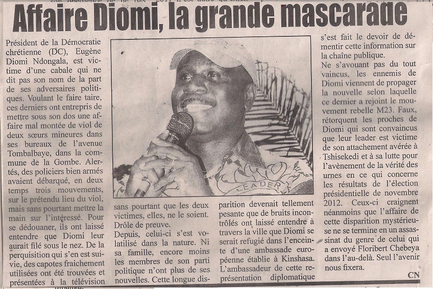 Non, On voudrait detourner l’attention de Congolais dans le dossier Diomi pour des faux motifs alors que les vrais sont en réalité politiques. Diomi derange Kabila et tous ceux qui entourent Kabila. Kabila a triche aux elections du 28/11/2011 au Congo. Kabila a falsifié les resultats electoraux. Il n’etait pas élu. L’élu à ces élections est M. Etienne Tshisekedi. Kabila n’en a pas le sommeil tranquille jusqu’ici. Il vit en expédiant les affaires courantes par tout ces temps qui passent.
