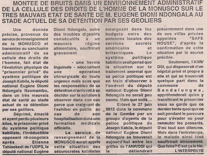 TRES GRAVES SOUCIS POUR L’ETAT DE SANTE D’EUGENE DIOMI NDONGALA, SELON LA CELLULE DES DROITS DE L’HOMME DE LA MONUSCO