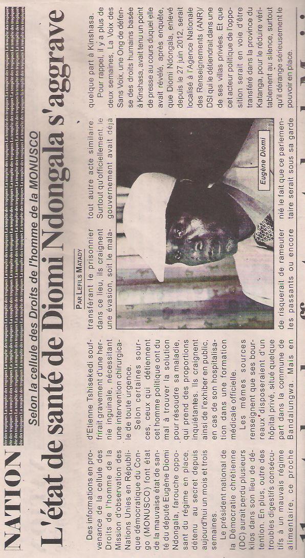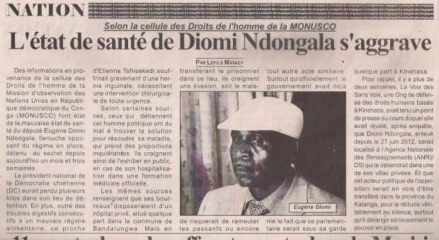 Des informations en provenance de la cellule des Droits de l’homme de la Mission d’observation des Nations Unies en République démocratique du Congo (MONUSCO) font état de la mauvaise état de santé du député Eugène Diomi Ndongala, farouche opposant du régime en place, détenu  au secret depuis aujourd’hui un mois et trois semaines.