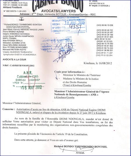 VOICEI LA LETTRE DE MAITRE BONDO A L’ANR DEMANDANT QUE LA FAMILLE PUISSE RENDRE VISITE AU DEPUTE DIOMI NDONGALA
