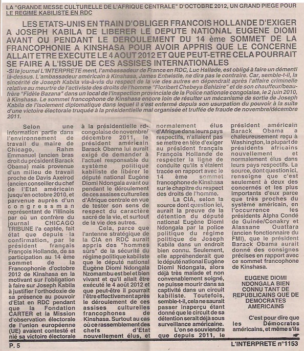 LES ETATS- UNIS EN TRAIN D’OBLIGER FRANCOIS HOLLANDE D’EXIGER A JOSEPH KABILA DE LIBERER LE DEPUTE NATIONAL EUGENE DIOMI NDONGALA AVANT OU PENDANT LE DEROULEMENT DU 14° SOMMET DE LA FRANCOPHONIE POUR AVOIR APPRIS QUE LE CONCERNE ALLAIT ETRE EXECUTE LE 04 AOUT 2012 ET QUE PEUT-ETRE CELA POURRAIT SE FAIRE A L’ISSUE DE CES ASSISES INTERNATIONALES / INTERPRETE 31/08/12