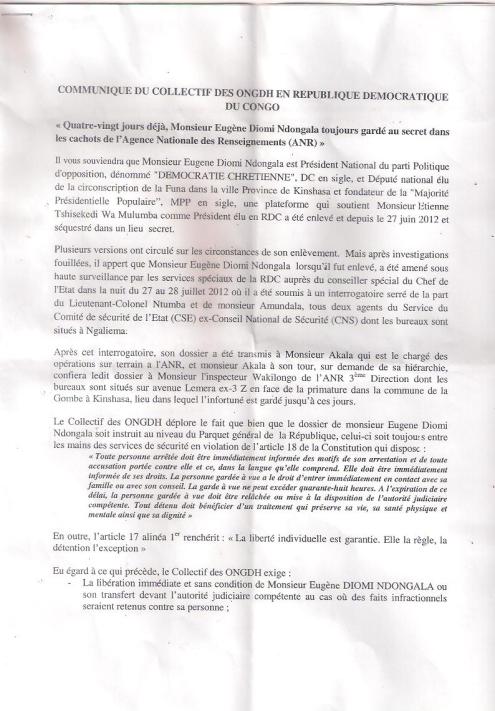 « Après investigations fouillée, il appert que Monsieur Eugene Diomi Ndongala lorsqu’il fut enlevé a été amené sous haute surveillance par les services spéciaux de la RDC dans la nuit du 27 au 28 juillet 2012, où il a été soumis à un interrogatoire serré. Après cet interrogatoire, son dossier a été transmis à l’ANR dont les bureaux sont situés sur l’avenue Lemera ex- 3 Z en face de la Primature dans la commune de la Gombe à Kinshasa, lieu dans lequel l’infortuné est gardé jusqu’à ce jour».