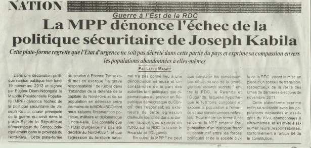 La MPP constate que l’Etat d’Urgence n’a pas été déclaré au Nord Kivu et que l’agression du territoire nationale n’a pas donné lieu à une dénonciation sérieuse et circonstanciée de la part des autorités politiques et diplomatiques au pouvoir en RDC, des responsables extérieurs de cette agression, d’ailleurs identifiés dans le dernier Rapport des experts de l’Onu sur la RDC daté 12 novembre 2012 : nous citons la République du Rwanda et celle de l’Ouganda.