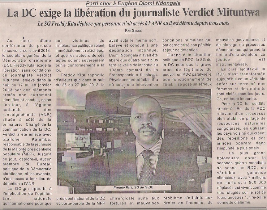 La DC exige la libération du journaliste Verdict Mituntwa et denonce les graves violations des droits de l’homme en RDC / LA TEMPETE DES TROPIQUES, 08/04/13