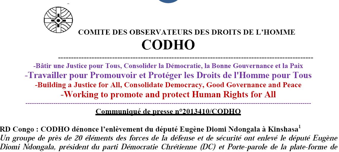R.D.Congo: CODHO DENONCE L’ENELVEMENT DU DEPUTE DIOMI NDONGALA A KINSHASA