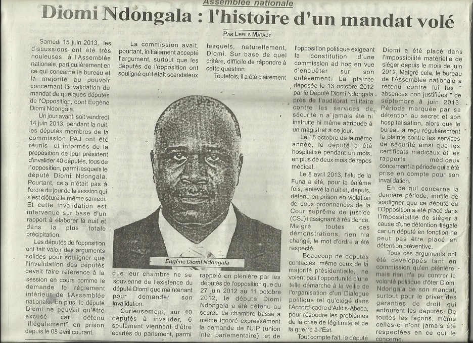 Le 14/06/2013 PENDANT LA NUIT, les députés membres de la commission PAG ont été réunis  et informés de la proposition de leur président d ‘invalidation de 40 députés – tous de l’ opposition – parmis lesquels résultait le nom du député Diomi Ndongala. Cela n’était pas à l’ordre du jour  de la session et surtout il n’était pas prévu le dernier jour de la session,  de plus sur la base d’un rapport à élaborer la nuit et dans la plus totale précipitation….