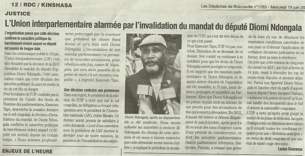 L’UNION INTERPARLEMENTAIRE ALARMEE PAR L’INVALIDATION DU MANDAT DU DEPUTE DIOMI NDONGALA / LA DEPECHE DE BRAZZAVILLE