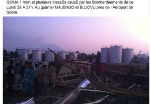 AU TOTAL 4 BOMBES SONT TOMBEES A GOMA   LA NUIT ENTRE LE  28 ET LE 29/08/13 A GOMA. 1 MORT ET 10 PERSONNES BLESSEES ET 10 MAISONS ENDOMMAGEES SELON LES PREMIERS BILANS.