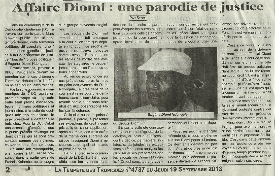 Dans un communiqué de la Démocratie chrétienne (DC), à travers son porte-parole Marc Mawete, publié lundi 16 septembre dernier, cette formation politique dit constater une » scandaleuse parodie de justice à la Cour suprême de justice « lors du » procès politique » d’Eugène Diomi Ndongala.