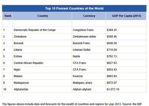 RDC: LE PAYS LE PLUS PAUVRE AU MONDE SELON LE REVENU GDP 2013: 394$ de moyenne de revenu par habitant, selon le FMI par mpp le 1 octobre 2013TOP 10 POOREST COUNTRY IN THE WORLD FMI 10 POOREST COUNTRY IN THE WORLDTOP 10 POOREST COUNTRY IN THE WORLD FMI