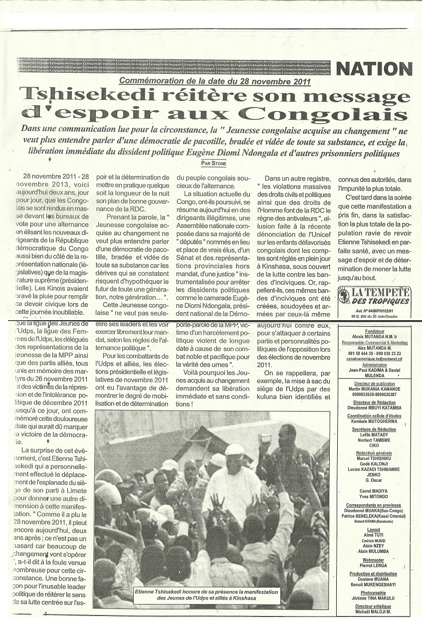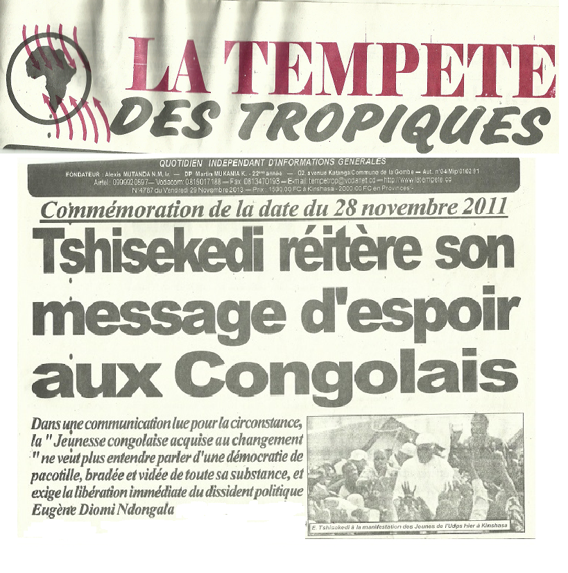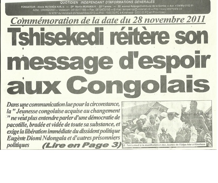 l’esplanade du siège de son parti à Limete pour donner une autre dimension à cette manifestation. » Comme il a plu le 28 novembre 2011, il pleut encore aujourd’hui, deux ans après ; ce n’est pas un hasard car beaucoup de changement vont s’opérer « , a-t-il dit à la foule venue nombreuse pour cette circonstance. Une bonne façon pour l’inusable leader politique de réitérer le sens de sa lutte centrée sur l’espoir et la détermination de mettre en pratique quelque soit la longueur de la nuit son plan de bonne gouvernance de la RDC.
