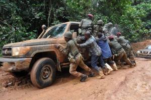 Ainsi le « candidat des 5 chantiers[1] », qui a toujours évité les débats avec ses adversaires politiques, a dû faire face à un adversaire inattendu : la nature. Quelques temps seulement après avoir quitté Kisangani, le cortège présidentiel s’est retrouvé empêtré dans une route atrocement boueuse et en état de délabrement avancé. Le Président est obligé de descendre pendant que l’ensemble de sa délégation se découvre un nouveau métier : cantonniers. Tout le monde s’emploie, pour ainsi dire, à « mettre la main à la pâte ».