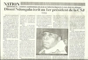 Elle porte donc atteinte non seulement au droit de la défense, mais encore aux droits garantis aux particuliers par les lois. Par ailleurs, la Cour Suprême de Justice s’est illustrée, dans sa démarche à l’audience du 12 mars 2014, par une autre atteinte aux droits de la défense. Diomi regrette également qu’à cette audience, la Cour, après avoir entendu les deux prétendues victimes, tour à tour, puis leur prétendu père, « a demandé seulement au prévenu que je suis, si je contestais et rejetais en bloc tout ce que les précités ont déclaré ici à l’audience “. Ceci, en vue de donner la parole au ministère public de requérir sans que la procédure prévue à l’article 74 précité du code de procédure pénale, pourtant d’ordre public, ne soit respectée. Ce qui heurte davantage le principe du contradictoire sur le déroulement de l’instruction d’une cause à l’audience. Au regard de cette situation, conclut la lettre, “j’ai introduit une requête en réouverture des débats en bonne et due forme au greffe de la CSJ, et sollicite en même, temps que les audiences dans cette cause soient publiques. Ce, pour raison de transparence et d’équité, et même pour une bonne administration de la justice ».