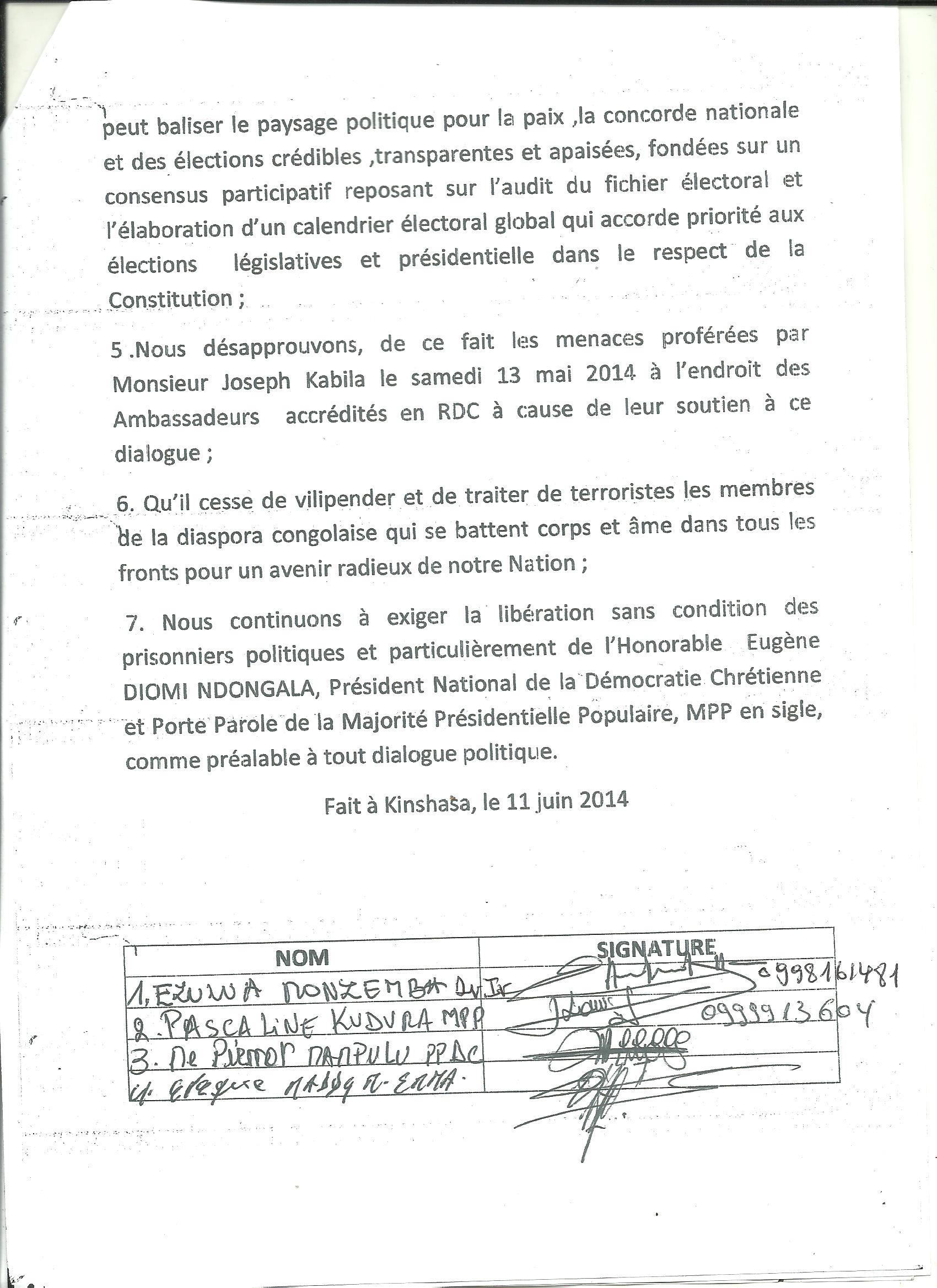 5 .Nous désapprouvons, de ce fait les menaces proférées par Monsieur Joseph Kabila le samedi 13 mai 2014 à l’endroit des Ambassadeurs accrédités en RDC à cause de leur soutien à ce dialogue ;