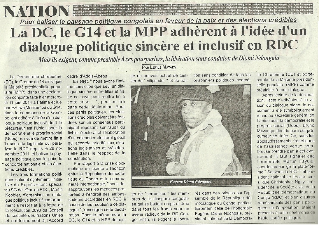 La Démocratie chrétienne (DC), le Groupe de 14 ainsi que la Majorité présidentielle populaire (MPP), dans une déclaration conjointe faite hier mercredi 11 juin 2014 à Fatima et lue par Ezulwa Monzemba du G14, dans la commune de la Gombe, ont adhéré à l’idée d’un dialogue politique inclusif dont le précurseur est l’Union pour la démocratie et le progrès social (Udps), en vue de mettre fin à la crise de légitimité qui paralyse la RDC depuis le 28 novembre 2011, et baliser le paysage politique pour la paix, la concorde nationale et les élections crédibles.