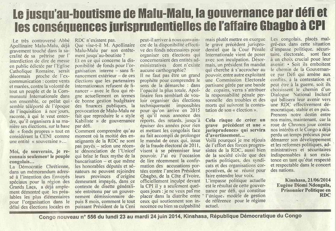 Le très controversé Abbé Apollinaire Malu-Malu, déjà gravement touché dans la sacralité de sa prêtrise par l’ interdiction de dire de messe en public édictée par l’Eglise Catholique Romaine, serait désormais proche de l’excommunication : contre vents et marées, contre la volonté de tout un peuple et de la Communauté Internationale dans son ensemble, ce prélat qui semble téléporté de l’époque de l’inquisition à nos jours, raconte, à qui le veut entendre, qu’il organisera à sa manière ses élections, sur la base de « fonds propres » tout en considérant la CENI comme une entité « souveraine »…