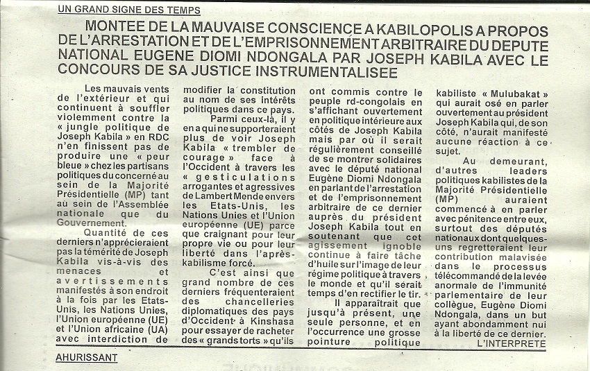 MONTEE DE MAUVAISE CONSCIENCE A KABILOPOLIS A PROPOS DE L’ARRESTATION ET DE L’EMPRISONNEMENT ARBITRAIRE DU DEPUTE NATIONAL EUGENE DIOMI NDONGALA PAR JOSEPH KABILA AVEC LE CONCNOURS DE SA JUSTICE INSTRUMENTALISEE / INTERPRETE