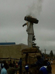 SUPPLICE DU COMLLIER IMPOSE A LA STATUE DE KABILA EN FEU – BENI – NORD KIVU LE 02/11/2014 MATIN APRES UN NOUVEAU CARNAGE A BENI – LA POPULATION EXAXPEREE DANS LA RUE