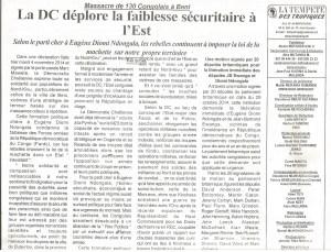Selon la DC, au lieu de convoquer l’Etat-major des Fardc et de la Police, sanctionner, réorganiser les opérations militaires musclées contre les groupes armée indexés, renforcer les troupes d’élites avec les commandos de Kindu, coordonner les opérations militaires, renforcer les renseignements, assurer le paiement des soldes des militaires au front et les primes de combat… on ne s’est limité qu’à faire appel à une armée de substitution, celle de la Monusco, alors que Kinshasa entretient une guerre de tranchées avec l’Onu après la récente expulsion du Représentant du Haut Commissaire pour les Droits de l’Homme en RDC, coupable d’avoir publié un rapport sur d’autres massacres des civils qui ont eu lieu à Kinshasa à travers l’opération Likofi