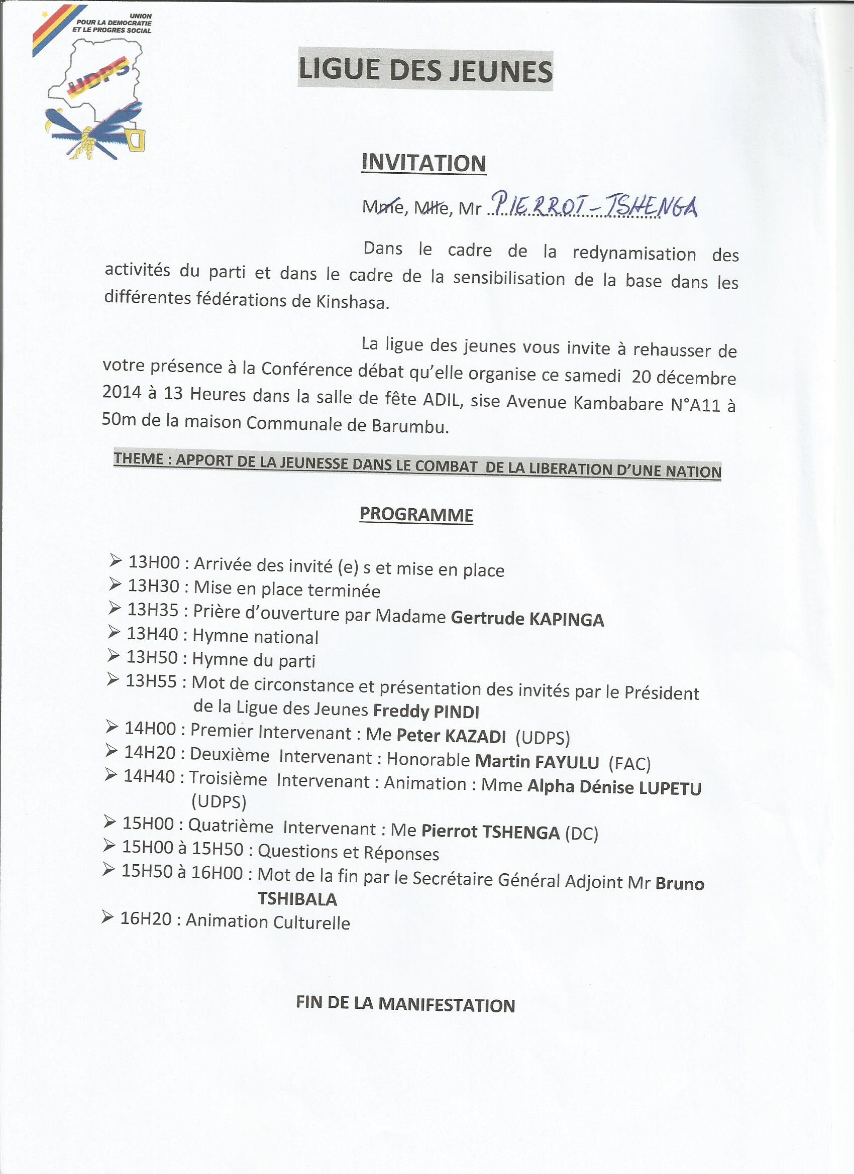 CONFERENCE/DEBAT : INTERVENTION DE LA DEMOCRATIE CHRETIENNE A LA CONFERENCE DEBAT DE LA LIGUE DES JEUNES DE L’UDPS, SOUS LE THEME DE L’APPORT DE LA JEUNESSE DANS LE COMBAT DE LIBERATION D’UNE NATION – 20/12/2014 KINSHASA