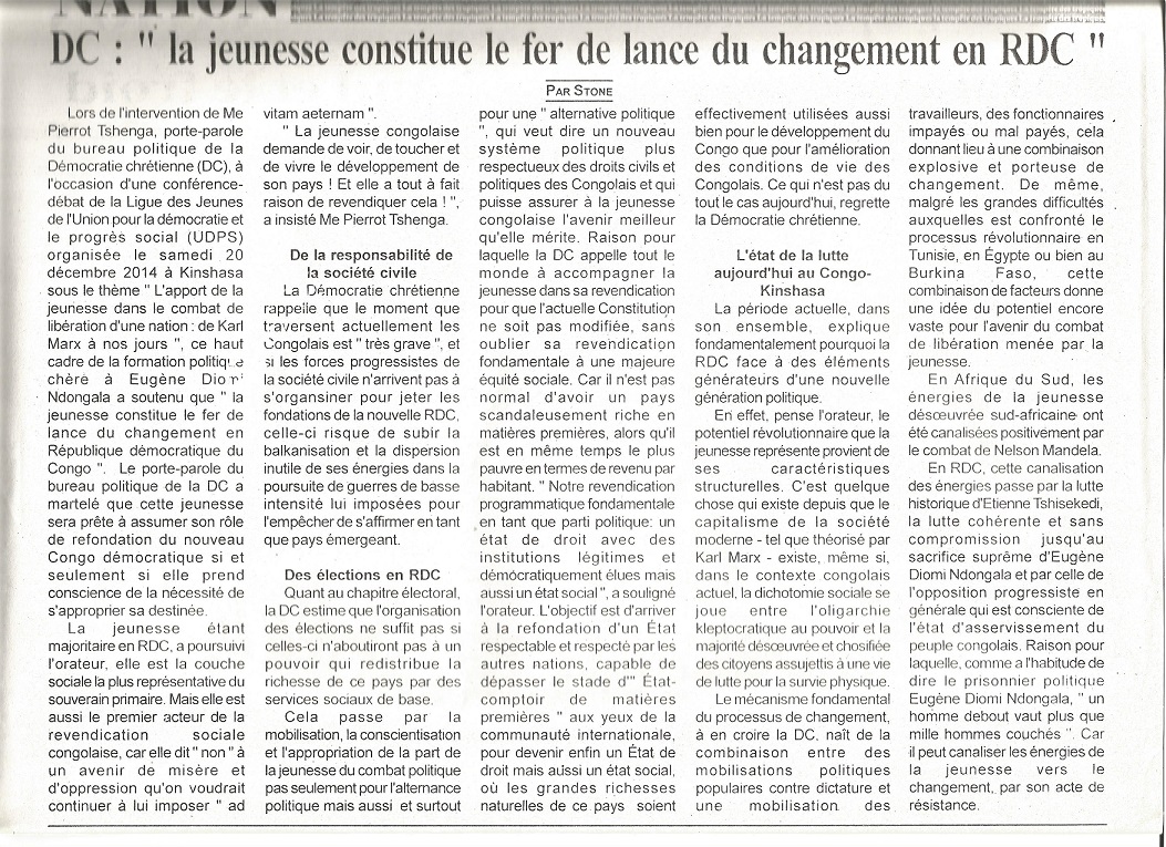 Lors de l’intervention de Me Pierrot Tshenga, porte-parole du bureau politique de la Démocratie chrétienne (DC), à l’occasion d’une conférence-débat de la Ligue des Jeunes de l’Union pour la démocratie et le progrès social (UDPS) organisée le samedi 20 décembre 2014 à Kinshasa sous le thème » L’apport de la jeunesse dans le combat de libération d’une nation : de Karl Marx à nos jours « , ce haut cadre de la formation politique chère à Eugène Diomi Ndongala a soutenu que » la jeunesse constitue le fer de lance du changement en République démocratique du Congo « .