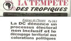Dans un communiqué du Bureau politique de la Démocratie chrétienne (DC) du 7 mars 2015, signé par son porte-parole Jean-Pierre Boka Kapella, cette formation politique chère à Eugène Diomi Ndongala dénonce un processus électoral non inclusif et le découpage territorial aux colorations politiques. Ce constat malheureux a été fait lors d’une réunion tenue le vendredi 6 mars pour prendre position par rapport à l’actualité politique du moment.