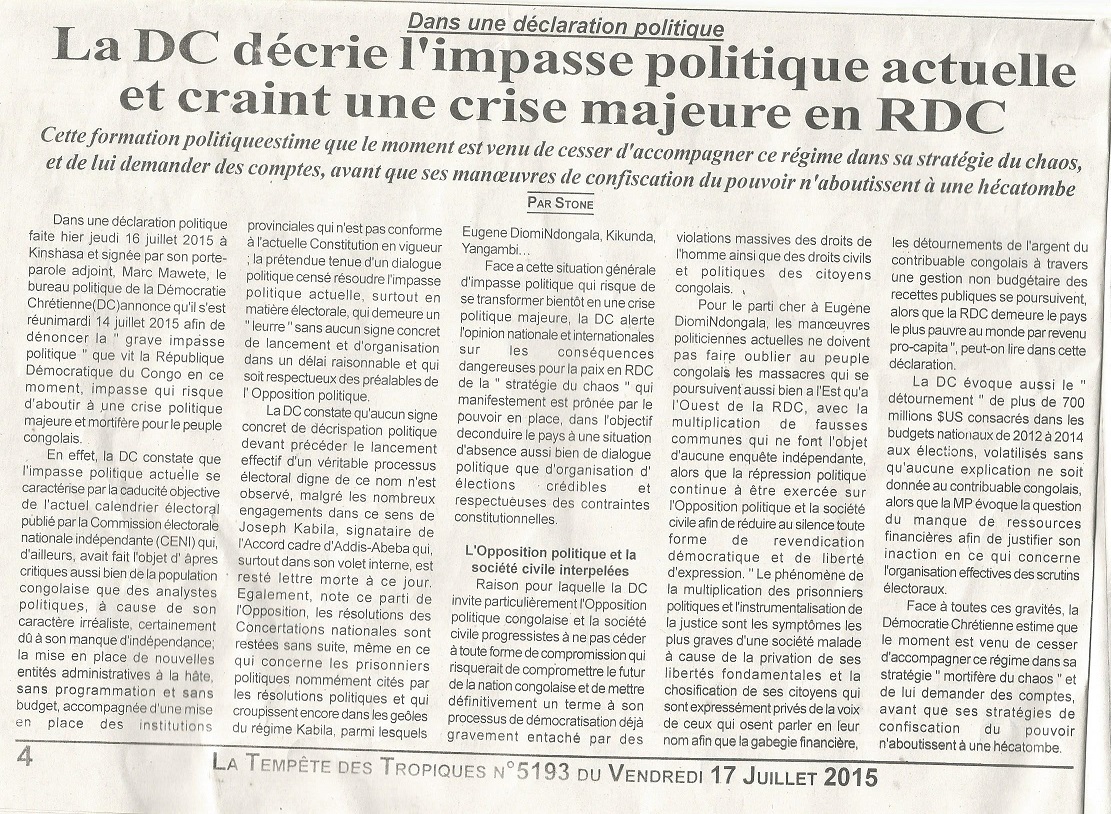 Dans une déclaration politique faite hier jeudi 16 juillet 2015 à Kinshasa et signée par son porte-parole adjoint, Marc Mawete, le bureau politique de la Démocratie Chrétienne(DC)annonce qu’il s’est réunimardi 14 juillet 2015 afin de dénoncer la » grave impasse politique » que vit la République Démocratique du Congo en ce moment, impasse qui risque d’aboutir à une crise politique majeure et mortifère pour le peuple congolais.