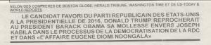 LE CANDIDAT FAVORI DU PARTI REPUBLICAIN DES ETATS-UNIS A LA PRESIDENTIELLE DE 2016, DONALD TRUMP, REPROCHERAIT AU PRESIDENT BARACK OBAMA SA MOLLESSE ENVERS JOSEPH KABILA DANS LE PROCESSUS DE LA DEMOCRATISATION DE LA RDC ET DANS « L’AFFAIRE EUGENE DIOMI NDONGALA » / Interprete du 13/08/2015