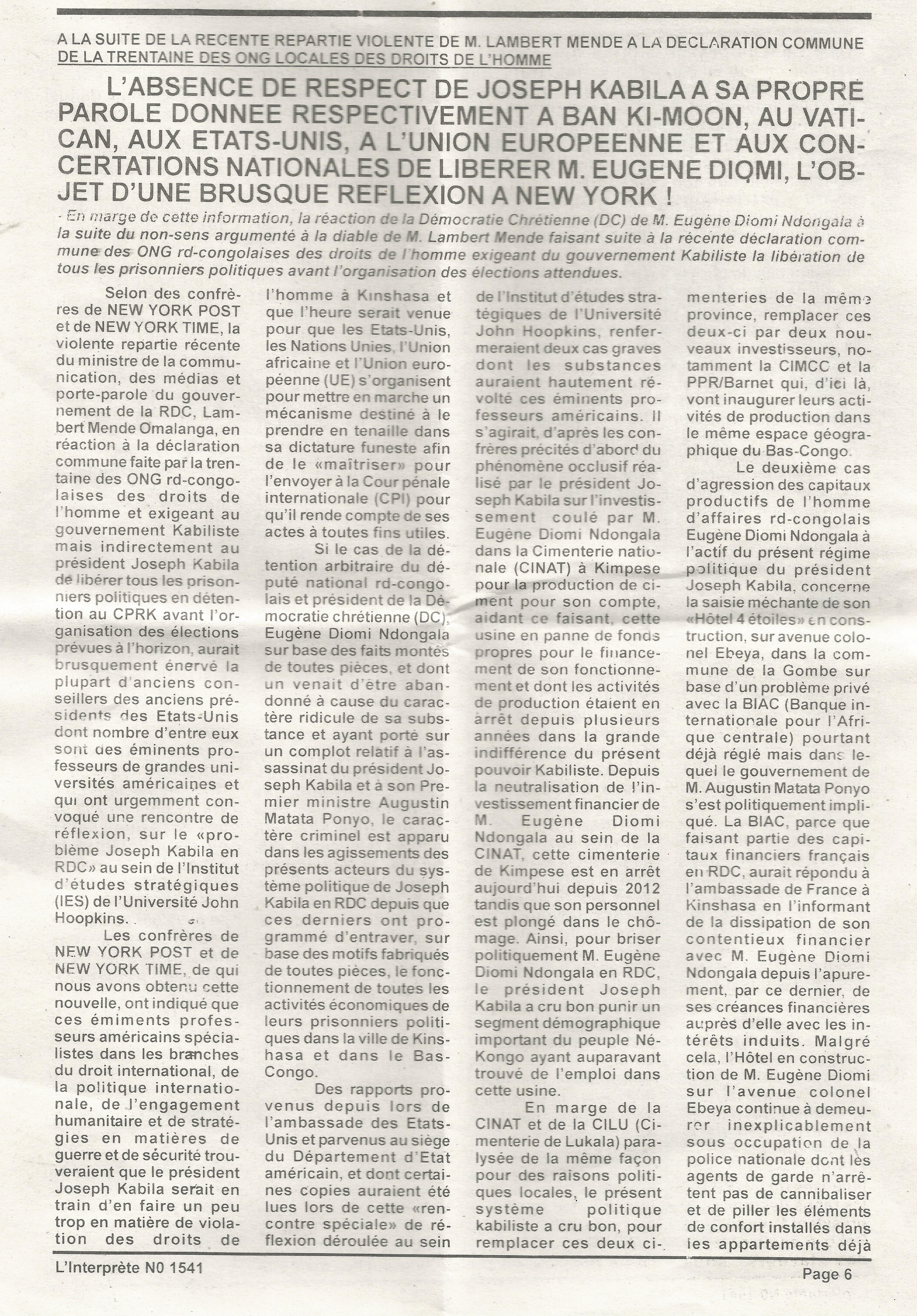 L’ABSENCE DE RESPECT DE KABILA A SA PROPRE PAROLE DONNEE RESPECTIVEMENT A BAN KI-MOON, AU VATICAN, AUX ETATS UNIS, A L’UNION EUROPEENNE ET AUX CONCERTATIONS NATIONALES DE LIBERER M. EUGENE DIOMI NDONGALA, FAIT L’OBJET D’UNE BRUSQUE REFLEXION A NEW YORK