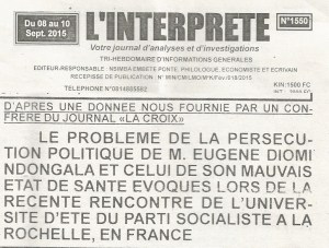 LE PROBLEME DE LA PERSECUTION POLITIQUE DE M. EUGENE DIOMI NDONGALA ET CELUI DE SON MAUVAIS ETAT DE SANTE EVOQUES LORS DE LA RECENTE RENCONTRE DE L’UNIVERSITE D’ETE DU PARTI SOCIALISTE A LA ROCHELLE, EN FRANCE /INTERPRETE