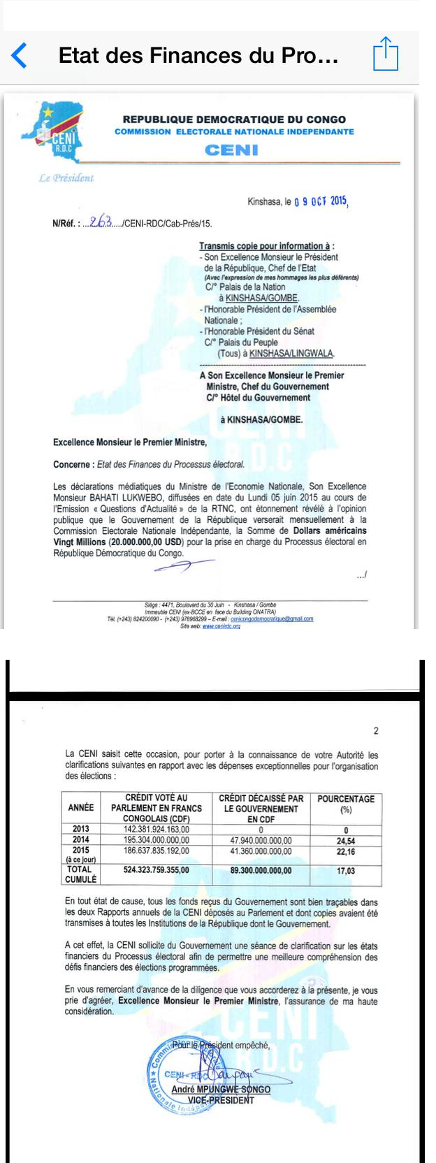 La CENI vient d’ adresser au chef de l’exécutif Kabiliste, une lettre reproduisant le résumé des fonds qui lui ont été alloués depuis 2013 pour le financement des élections.