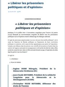 Kinshasa, le 26 juillet 2016- L’Association congolaise pour l’accès à la justice (ACAJ) demande au Gouvernement congolais de libérer tous les prisonniers politiques et/ou d’opinion avant le démarrage du dialogue national.
