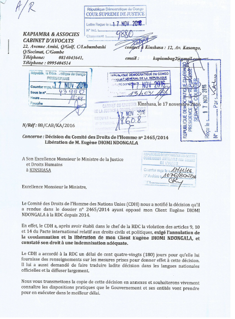 Le 22 septembre 2014, Eugène Diomi Ndongala a porté plainte contre la RDC devant le CDH pour détention au secret, privation de soins de santé en prison et déni de garanties d’un procès équitable, constitutifs de violation des articles 9, 10 et 14 du Pacte international relatif aux droits civils et politiques[1].