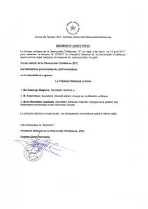 RESTRUCTURATION DE LA DEMOCRATIE CHRETIENNE: EUGENE DIOMI NDONGALA NOMME UN SECRETAIRE GENERAL A.I. ET 2 SECRETAIRES GENERAUX ADJOINTS