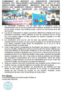 COMMUNIQUE DU 08/072017: LA DEMOCRATIE CHRETIENNE DENONCE LES TRACASSERIES QUOTIDIENNES, LES VOLS ET LES ARRESTATIONS ARBITRAIRES IMPOSEES PAR LES MILITAIRES POSTES AUX BARRIERES ERIGEES PARTOUT DANS LA VILLE DE KINSHASA ET QUI CHOSIFIENT LES CITOYENS CONGOLAIS