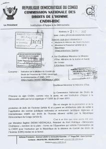 La Commission nationale des droits de l’homme (CNDH), institution d’appui à la démocratie et organe technique d’application des traités se référant aux droits de l’homme dans l’ordonnancement juridique congolais, vient de faire parvenir une lettre aussi bien à Eugène Diomi Ndongala qu’aux ministres de la Justice et des Droits humains, avec copie au Procureur général de la République, dans laquelle elle demande aux organes habilités de donner exécution immédiate à la décision 2465/2014 du Comité des droits de l’homme de l’ONU.