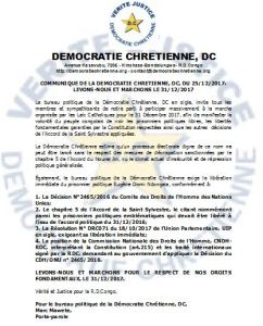 Le bureau politique de la Démocratie Chrétienne, DC en sigle, invite tous les membres et sympathisants de notre parti à participer massivement à la marche organisée par les Laïc Catholiques pour le 31 Décembre 2017, afin de manifester la volonté du peuple congolais de voir les prisonniers politiques libres, les libertés fondamentales garanties par la Constitution respectées ainsi que les autres décisions de l’Accord de la Saint Sylvestre appliquées.