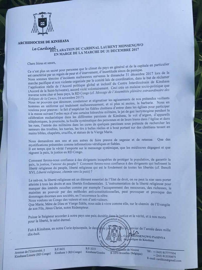 DECLARATION DU CARDINAL LAURENT MONSENGWO EN MARGE DE LA MARCHE DU 31 DECEMBRE 2017 – Kinshasa, le 02/01/2018