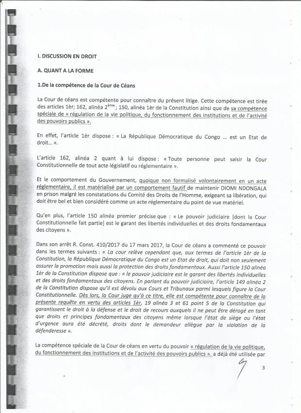 En plus de la violation de l’art 215 de la Constitution, qui reconnait la supériorité des traités signés par RDC sur la loi interne, l’Hon. Eugène Diomi Ndongala demande à l’Cour Constitutionnelle déclarer recevable sa requête, constatant que le comportement du gouvernement congolais viole les arts. 17, 16, 61 point 2 et 12 de la Constitution de la RDC, déclarant, par voie de conséquence que la détention de l’Hon. Eugène Diomi Ndongala anticonstitutionnelle et ordonner au Gouvernement de la RDC de prendre toutes mesures devant conduire à la libération du requérant.
