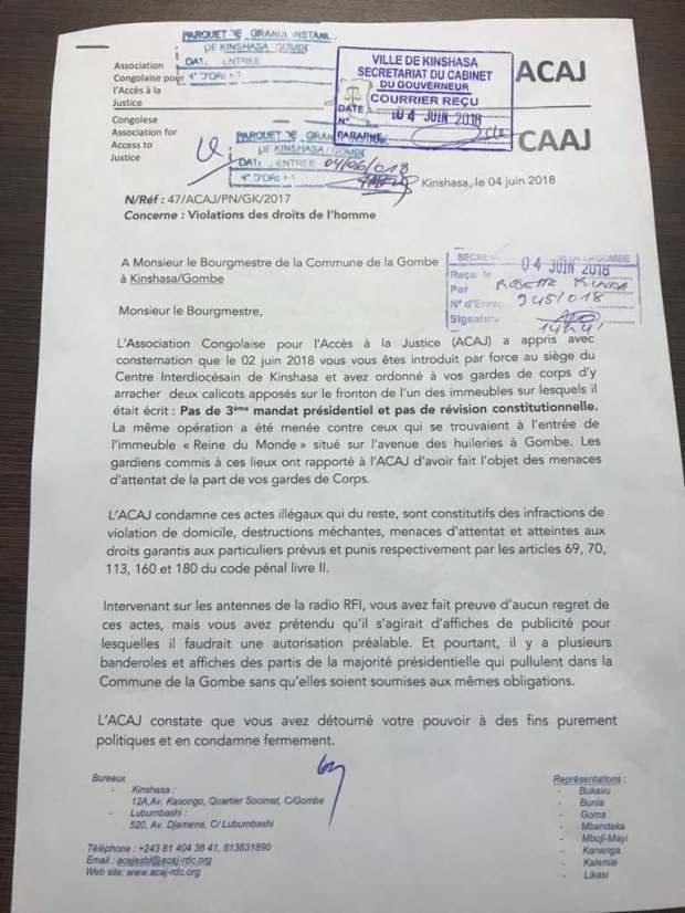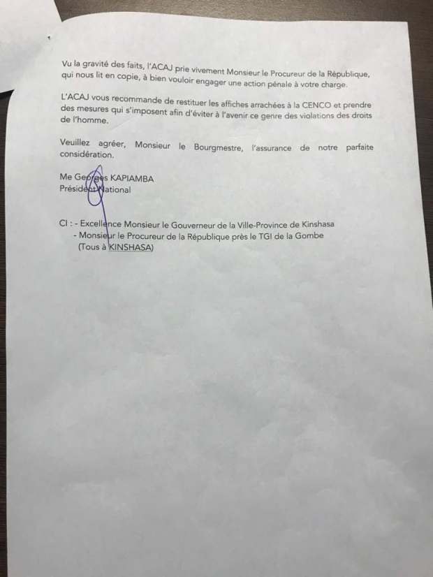 L’ACAJ DEMANDE AU PROCUREUR GENERAL DE LA REPUBLIQUE D’ ENGAGER UNE ACTION JUDICIAIRE CONTRE LE BOURGMESTRE DE LA GOMBE AYANT ARRACHÉ, PAR LA VIOLENCE, DES BANDEROLES VULGARISANT L’ACCORD DE LA ST. SYLVESTRE ET AFFICHEES AU CENTRE INTERDIOCESAIN DE LA CENCO