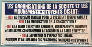 Nous, membres des organisations de la société civile et des mouvements citoyens signataires de la présente déclaration, engagés dans la lutte pour la sauvegarde de la démocratie par l’alternance démocratique et l’avènement de l’État de Droit en République Démocratique du Congo, condamnons la rhétorique et les appels de cadres de la majorité présidentielle à la candidature du président Joseph Kabila pour un troisième mandat et la révision de la constitution, en violation des dispositions des articles 70 et 220 de cette dernière, et de l’accord de la Saint-Sylvestre.