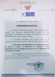 De toute ma vie, je n’ai jamais détenu d’ autre nationalité en dehors de la congolaise et j’estime que la DGM est tenue à corriger ce mensonge grossier et préjudiciable à mon honneur, dans le 48 heures dès la réception de la présente, faute de quoi je me réserve le droit d’assigner votre Direction Générale en justice, pour diffusion de faux bruits, faux et usage de faux.