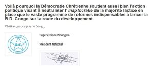 Voilà pourquoi la Démocratie Chrétienne soutient aussi bien l’action politique visant à neutraliser l’ inaptocratie de la majorité factice en place que le vaste programme de reformes indispensables à lancer la R.D. Congo sur la route du développement.