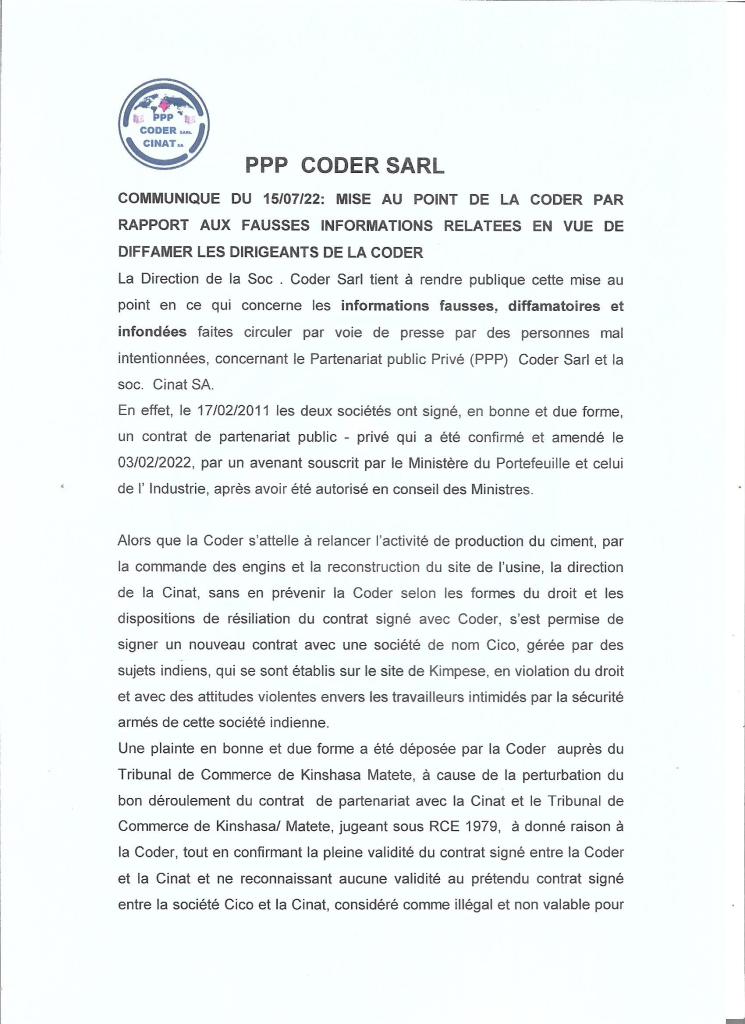 La Direction de la Soc . Coder Sarl tient à rendre publique cette mise au point en ce qui concerne les informations fausses, diffamatoires et infondées faites circuler par voie de presse par des personnes mal intentionnées, concernant le Partenariat public Privé (PPP) Coder Sarl et la soc. Cinat SA.