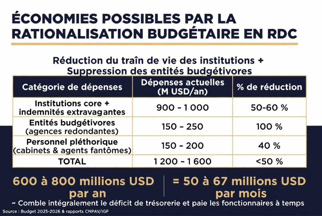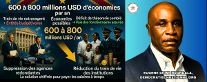 Comment procéder ? En supprimant immédiatement les entités budgétivores et agences redondantes rattachées, tout en réduisant de 50 à 60 % les indemnités extravagantes et les frais de fonctionnement des institutions. Pourquoi cette réforme est-elle indispensable ? Parce qu’elle générera 600 à 800 millions USD d’économies annuelles – soit 50 à 67 millions USD par mois –, comblant intégralement le déficit de trésorerie mensuel et assurant enfin le paiement ponctuel des salaires des fonctionnaires, sans nouvel endettement ni inflation.