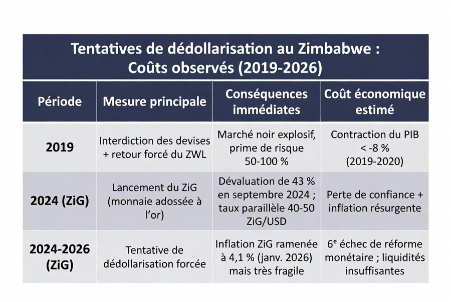 A noter qu’à la suite des échecs répétés de sa dédollarisation, à cause d’ une volonté dirigiste et sans préparation, le Zimbabwe est revenu à la dollarisation de son économie en 2025