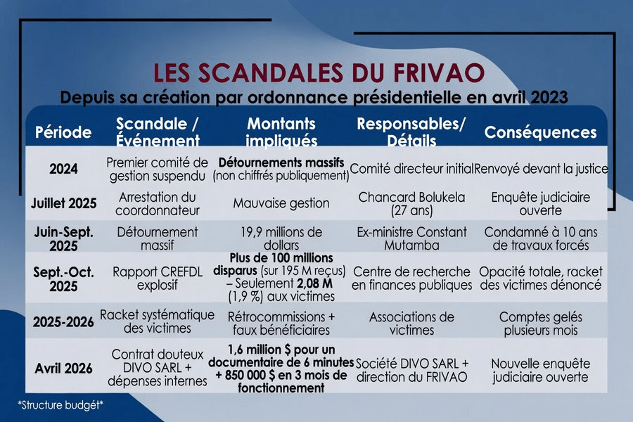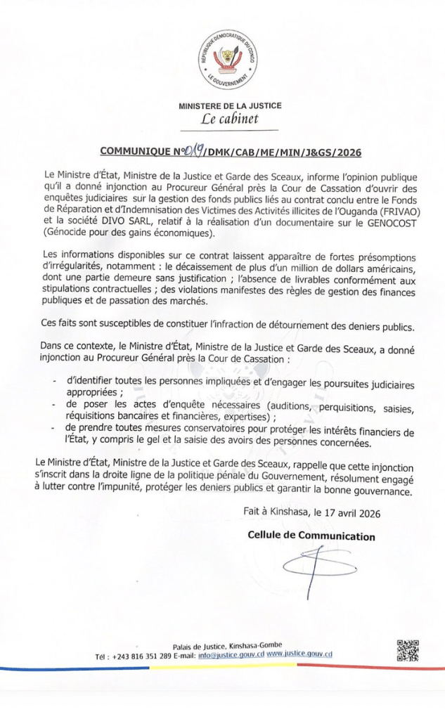 Et en avril 2026, rebelote : le ministre de la Justice ouvre une nouvelle enquête sur le détournement présumé de plus d’un million de dollars pour un contrat de gré à gré avec la société DIVO SARL. Objectif ? Un « documentaire » de… six minutes sur la guerre de Kisangani. En trois mois seulement, le fonds a aussi englouti au moins 850.000 dollars – selon le ministère de la Justice, qui a lancé l’enquête – rien que pour son fonctionnement interne.
