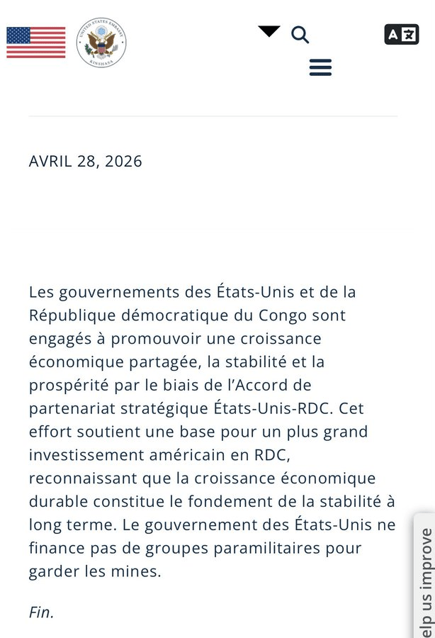 Dans une note officielle diplomatique rendue publique ce mardi 28 avril 2026, l’Ambassade des États-Unis à Kinshasa dément formellement et sans ambiguïté :« Les gouvernements des États-Unis et de la République démocratique du Congo sont engagés à promouvoir une croissance économique partagée, la stabilité et la prospérité par le biais de l’Accord de partenariat stratégique États-Unis–RDC. Cet effort soutient une base pour un plus grand investissement américain en RDC, reconnaissant que la croissance économique durable constitue le fondement de la stabilité à long terme. Le gouvernement des États-Unis ne finance actuellement aucune unité de patrouille ou de garde des mines en RDC. »