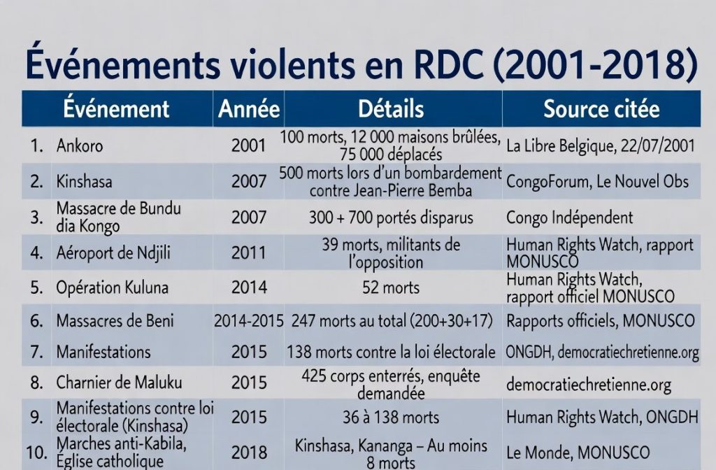 De l’horreur du massacre d’Ankoro en 2001 à l’attaque contre les militants de l’UDPS en 2016, en passant par les répressions sanglantes des manifestations de l’opposition, cet article retrace les événements clés qui ont jalonné cette ère tragique, tout en soulignant l’impunité persistante qui continue de hanter le pays.